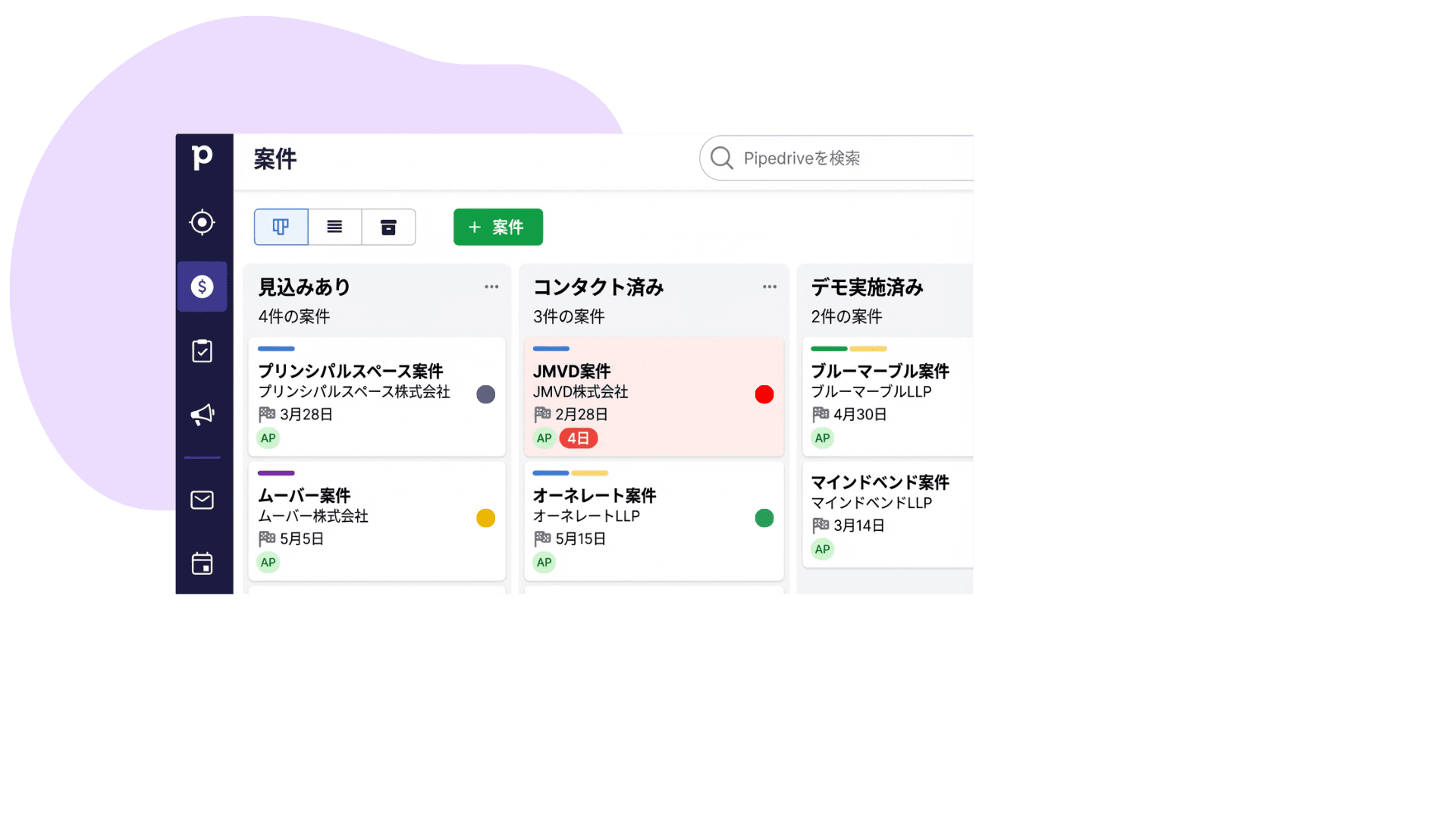 Android / iOSアプリで、PipedriveをそのままモバイルCRMとして利用できます。外出先でも、すべてのリード・連絡先・取引情報にすぐアクセスして更新できます。